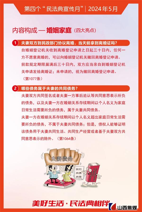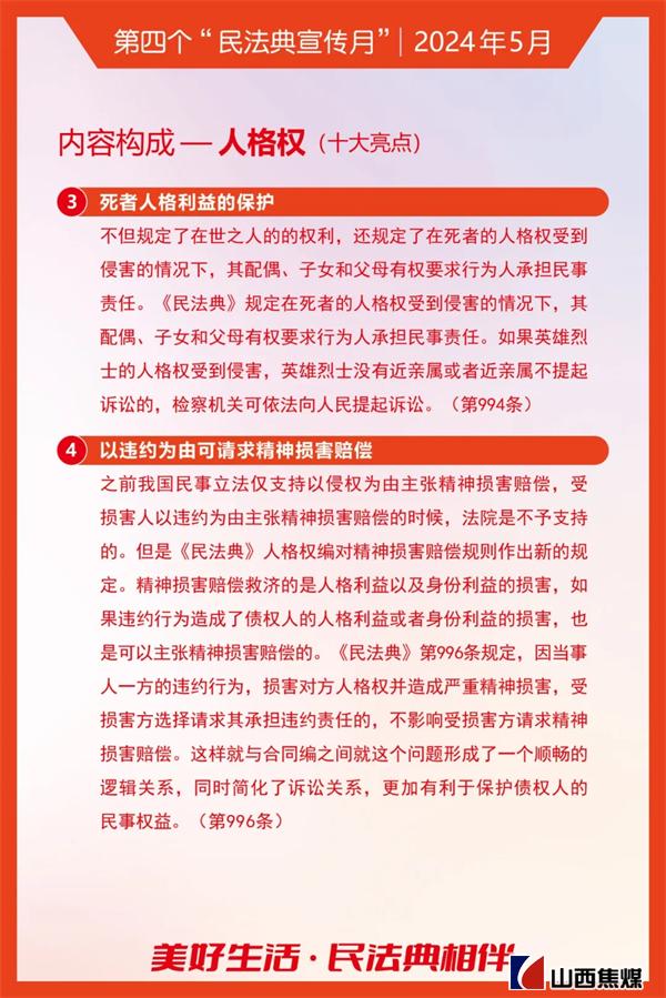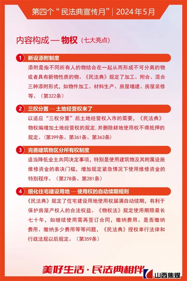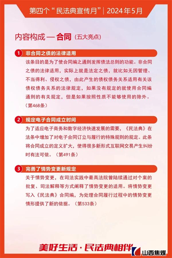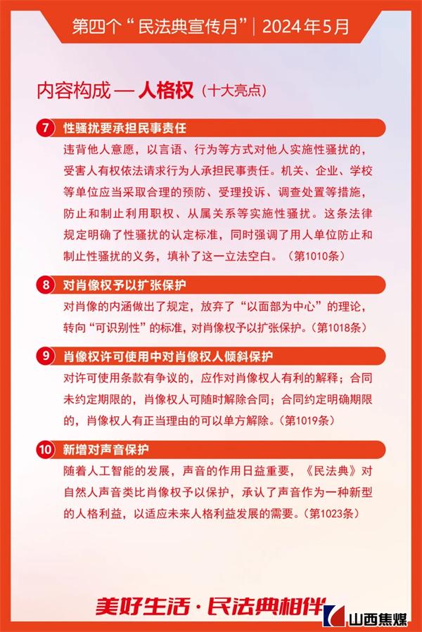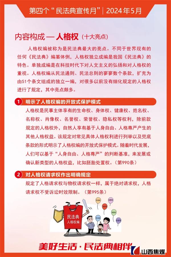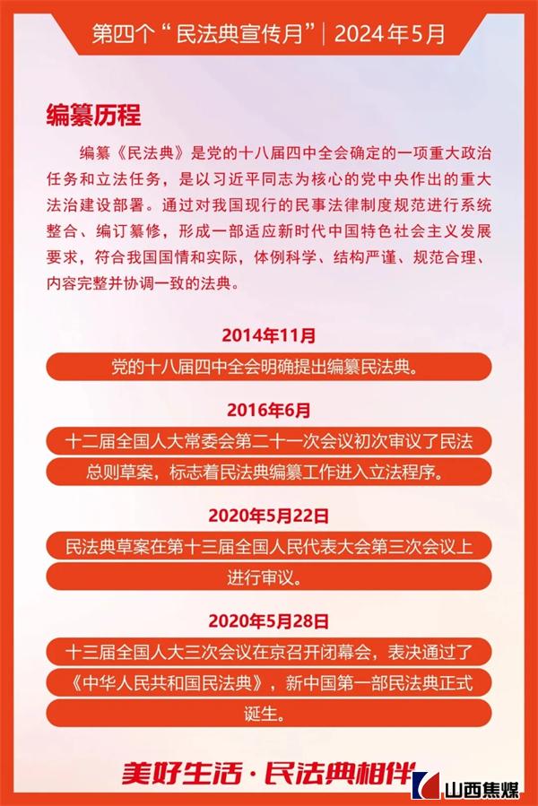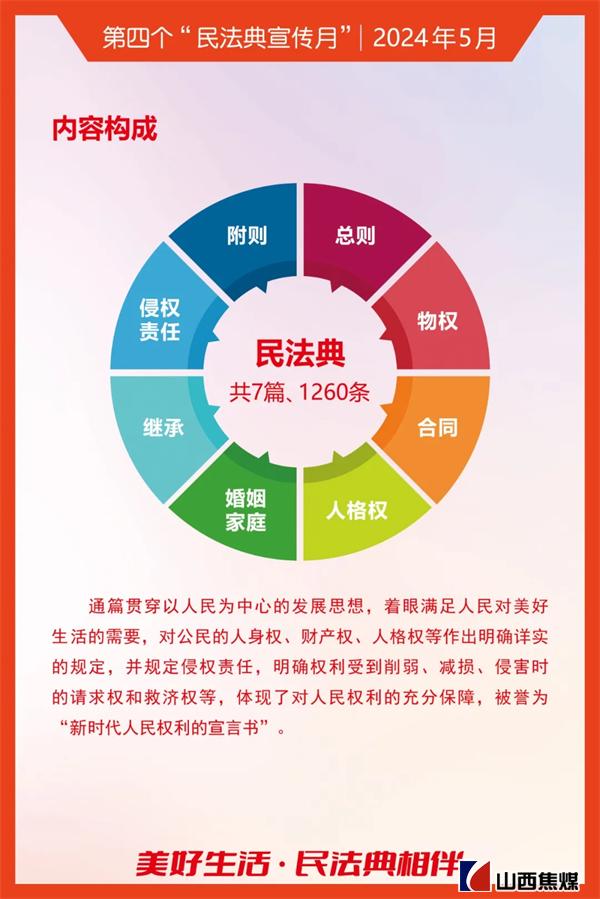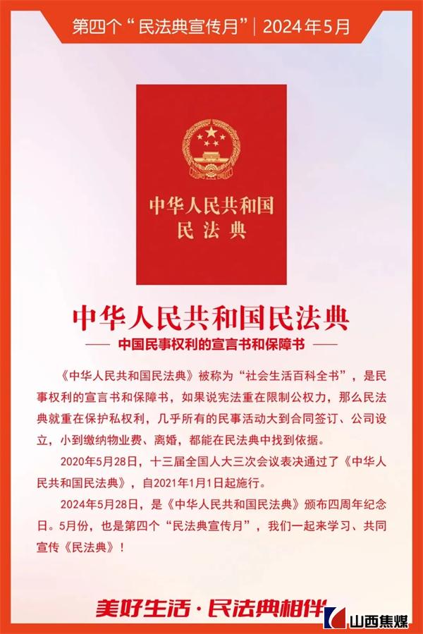 2024年5月是第四个“民法典宣传月”。为贯彻落实习近平总书记关于“法治是最好的营商环境”重要论述,根据上级安排部署,山西焦煤要求各单位把学习宣传贯彻《中华人民共和国民法典》作为今后一个时期内的重要政治任务,结合实际,务求实效,不断为山西焦煤高质量发展提供有力的法治保障。让我们一起来学习吧!