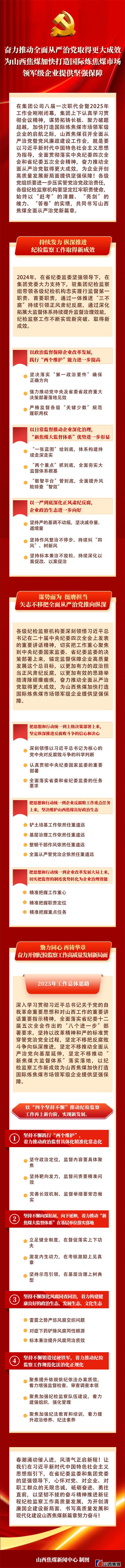 在3月27日召开的山西焦煤2025年度全面从严治党暨党风廉政建设工作会上,山西焦煤集团公司党委常委、省纪委监委驻集团公司纪检监察组组长郝点亮以《奋力推动全面从严治党取得更大成效 为山西焦煤加快打造国际炼焦煤市场领军级企业提供坚强保障》为题作了讲话,全面回顾总结2024年纪检监察工作,认真研究部署2025年工作任务。现将讲话内容制作成本期图解,请予以关注。