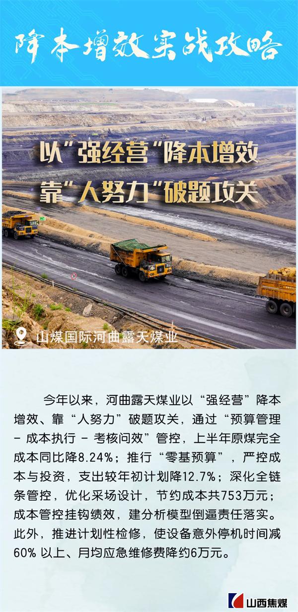 今年以来,山西焦煤上下紧紧围绕“强经营”发展策略,以降本增效为关键抓手,着力提升企业成本竞争力。各子分公司基层单位多措并举、狠抓落实,奏响降本增效最强音。今天,我们选取一组基层单位的降本增效实战案例,以海报形式分享给大家,旨在进一步激发广大干部职工“人努力”的主观能动性,持续为增强企业核心竞争力勇担使命、真抓实干!